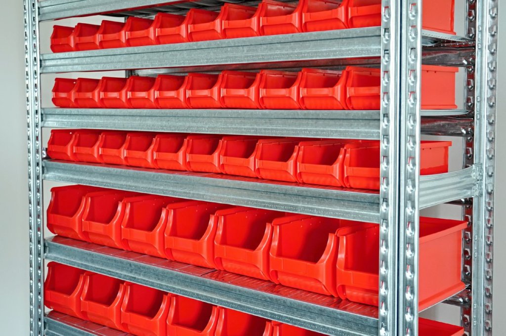 Bezskrutový kovový regál s plastovými boxy. 12x police, nosnosť 125 kg, nosnosť stĺpce 1100 kg. Rozmery regálu v. 1972 x š. 1124 x celý popis a parametre