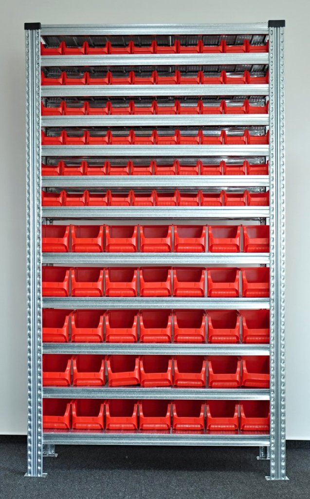 Bezskrutový kovový regál s plastovými boxy. 12x police, nosnosť 125 kg, nosnosť stĺpce 1100 kg. Rozmery regálu v. 1972 x š. 1124 x h. 330 mm. Obsahuje 60x plastový box 456231 a 35x plastový box 456209. Záruka 2 roky.