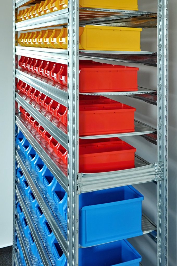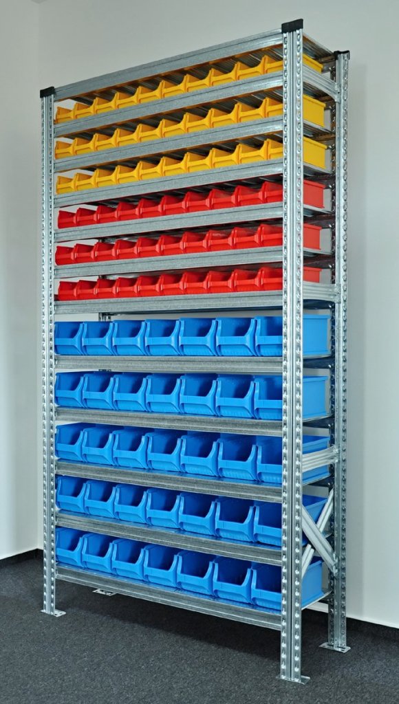 • bezskrutový kovový regál s plastovými boxy