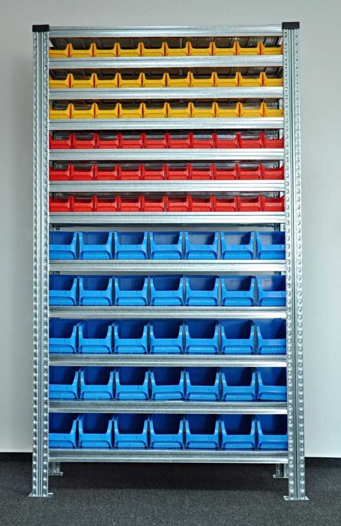 Bezskrutový kovový regál s plastovými boxy. 12x police, nosnosť 125 kg, nosnosť stĺpce 1100 kg. Rozmery regálu v. 1972 x š. 1124 x h. 330 mm. Obsahuje 30x plastový box 456232, 30x plastový box 456231 a 35x plastový box 456208. Záruka 2 roky.