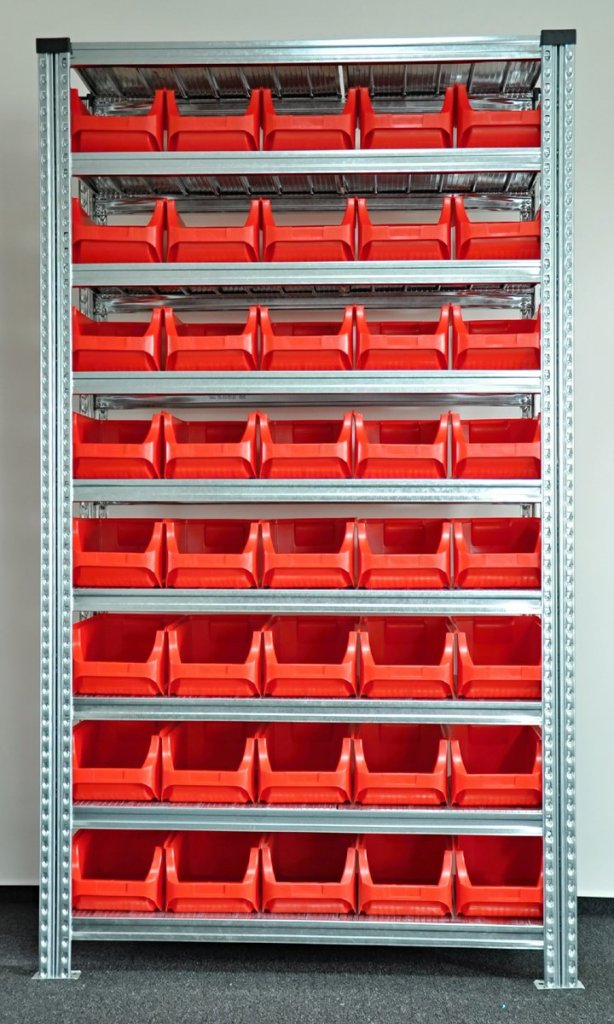 Bezskrutový kovový regál s plastovými boxy. 9x police, nosnosť 125 kg, nosnosť stĺpce 1100 kg. Rozmery regálu v. 1972 x š. 1124 x h. 410 mm. Obsahuje 40x plastový box 456213. Záruka 2 roky.