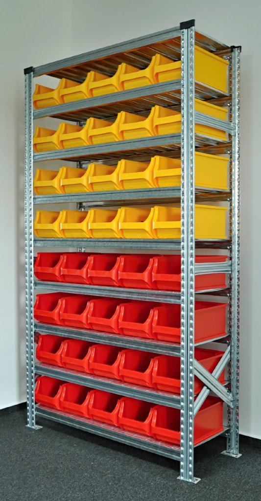Bezskrutový kovový regál s plastovými boxy. 9x police, nosnosť 125 kg, nosnosť stĺpce 1100 kg. Rozmery regálu v. 1972 x š. 1124 x h. 410 mm. Obsahuje 40x plastový box 456214. Záruka 2 roky.