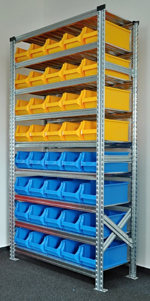 Bezskrutový kovový regál s plastovými boxy. 9x police, nosnosť 125 kg, nosnosť stĺpce 1100 kg. Rozmery regálu v. 1972 x š. 1124 x h. 410 mm. Obsahuje 20x plastový box 456214 a 20x plastový box 456212. Záruka 2 roky.