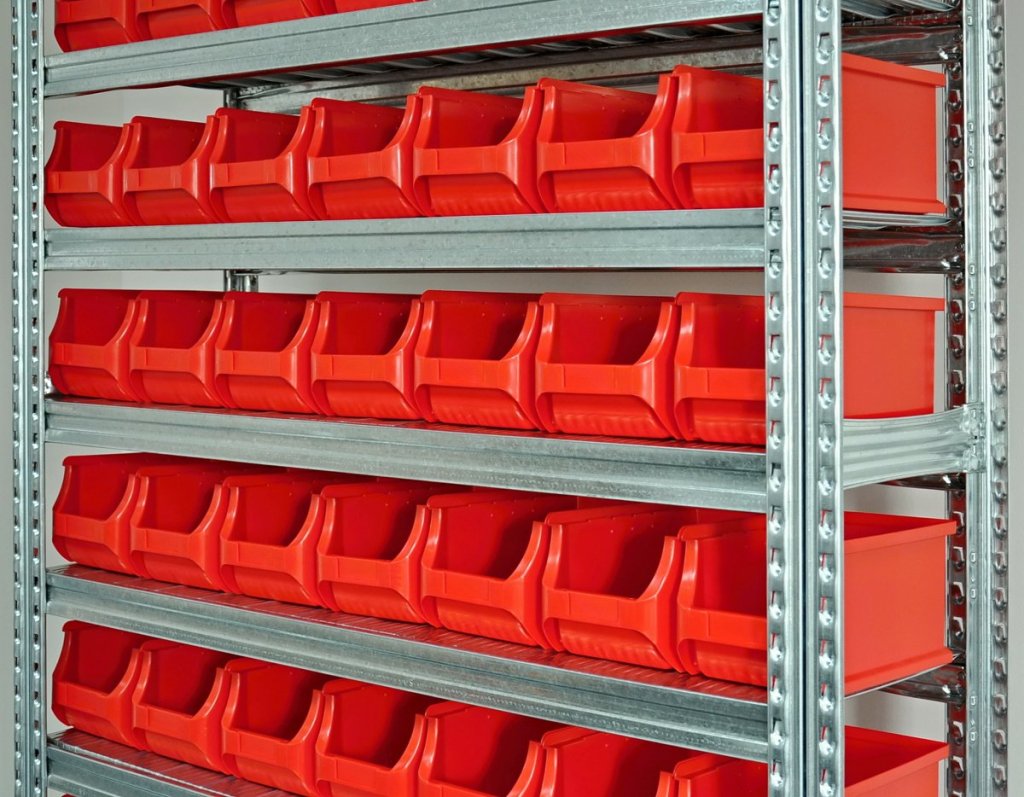 Bezskrutový kovový regál s plastovými boxy. 10x police, nosnosť 125 kg, nosnosť stĺpce 1100 kg. Rozmery regálu v. 1972 x š. 1124 x celý popis a parametre