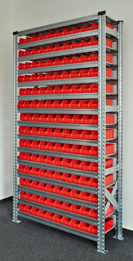 • bezskrutový kovový regál s plastovými boxy