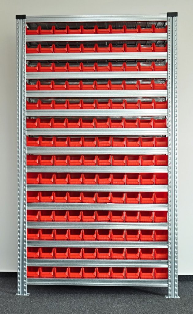 Bezskrutový kovový regál s plastovými boxy. 15x police, nosnosť 125 kg, nosnosť stĺpce 1100 kg. Rozmery regálu v. 1972 x š. 1124 x h. 330 mm. Obsahuje 140x plastový box 456231. Záruka 2 roky.
