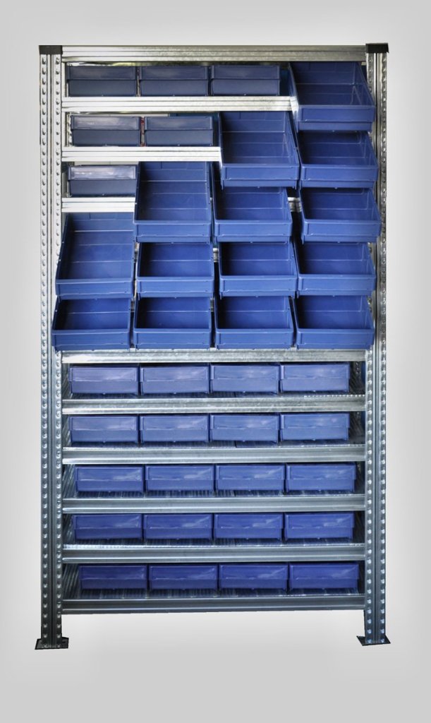 Regál s prepravkami 100 x 230 mm - 24 ks, 100 x 115 mm - 40 ks (4 modely)531.03 Eur bez DPH