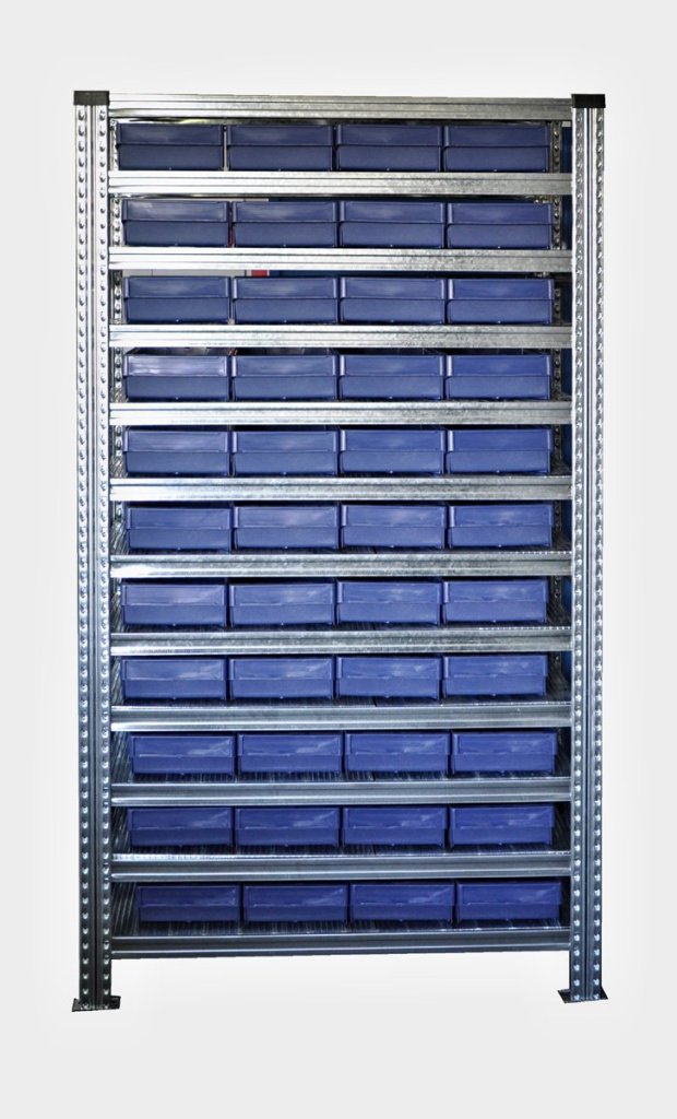Bezskrutový kovový regál s regálovými prepravkami. 12x police, nosnosť 125 kg, nosnosť stĺpce 1100 kg. Rozmery regálu v. 1972 x š. 1124 x h. 510 mm. Obsahuje 44 ks regálových prepraviek v. 100 x š. 230 x h. 500 mm. Záruka 2 roky.