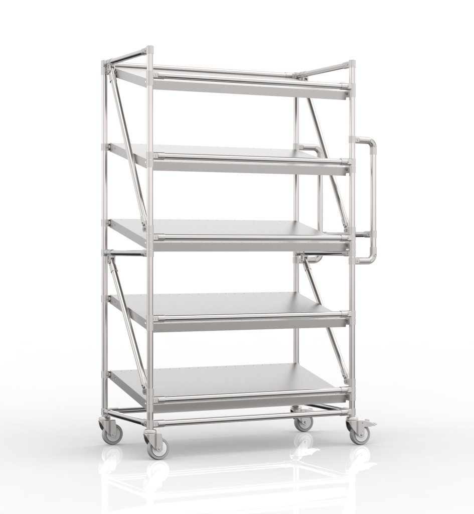 Súčasťou vozíka sú dve otočné kolieska s brzdou a dve otočné kolieska bez brzdy s priemerom 100 mm. Prednosťou týchto koliesok je nízky valivý odpor a vďaka tomu komfortná manipulácia. Konfiguráciu koliesok je možné zmeniť podľa požiadaviek zákazníka. Vozík je tiež vybavený ergonomickou rukoväťou pre ľahšiu a komfortnejšiu manipuláciu. Celková nosnosť 300 kg, nosnosť na polici 60 kg. Rozmery 1807 x 1066 x 567 mm.