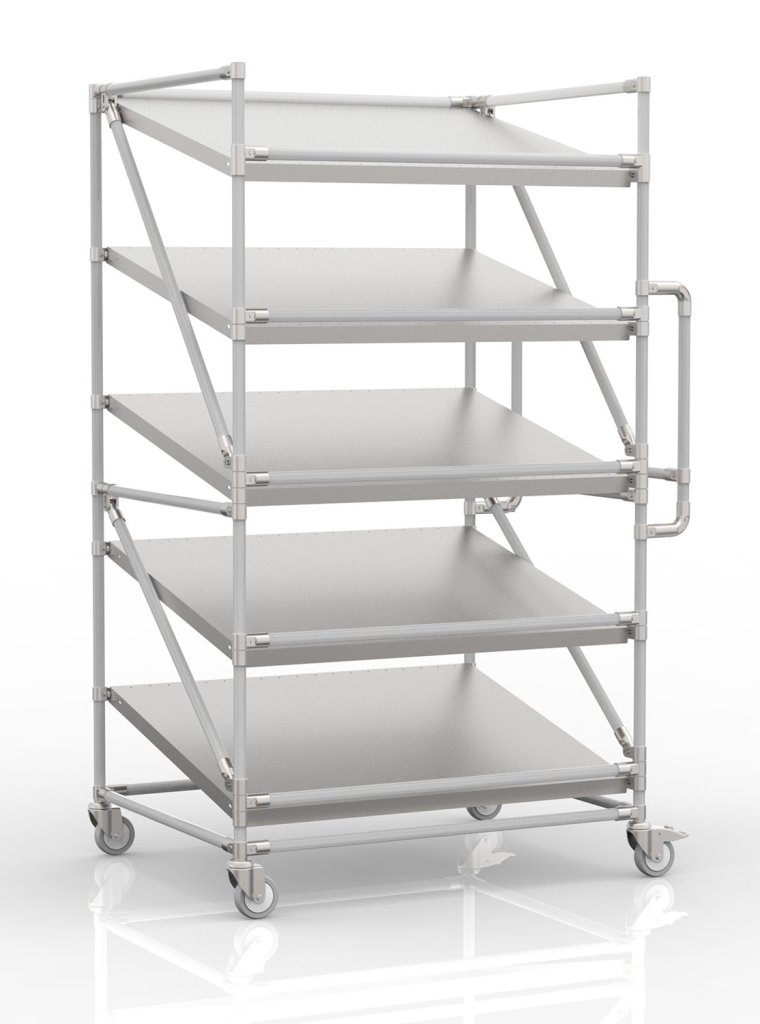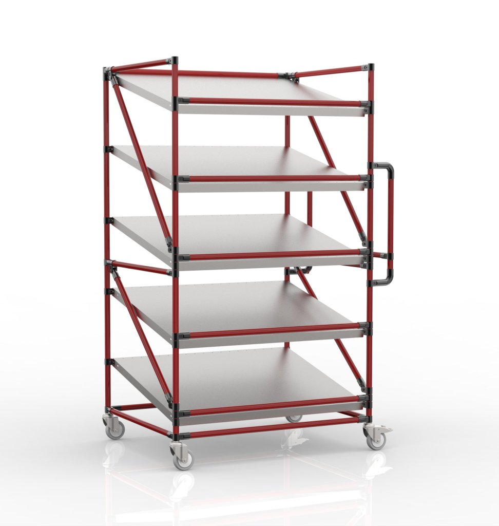 Regálový vozík na prepravky s piatimi šikmými policami je praktickým pomocníkom na manipuláciu vo výrobných firmách a logistických centrách.