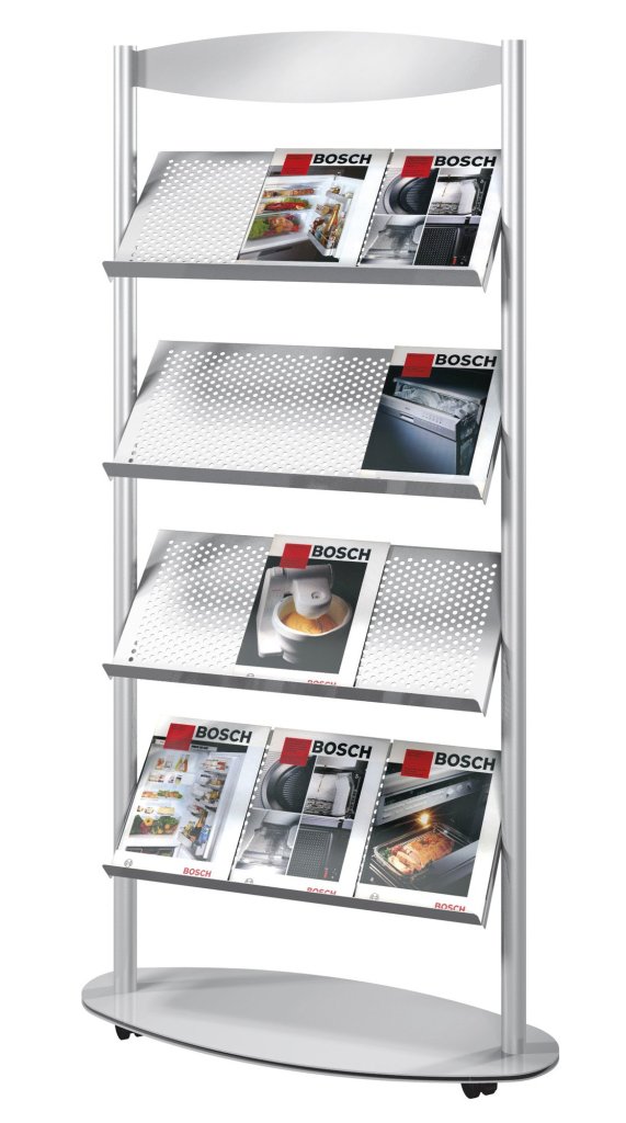 Stojan Ecoline typ 6356 pre uloženie prospektov, kapacita 16x DIN A4. Oceľová konštrukcia sa 4 akrylovými policami sa 40 mm spodným okrajom. Súčasťou balenia je "Info" fólia. Mobilný na brzdených kolieskach. Spodnú policu môžete premiestniť do vodorovnej polohy. Rozmer 1600 x 910 x 350 mm.