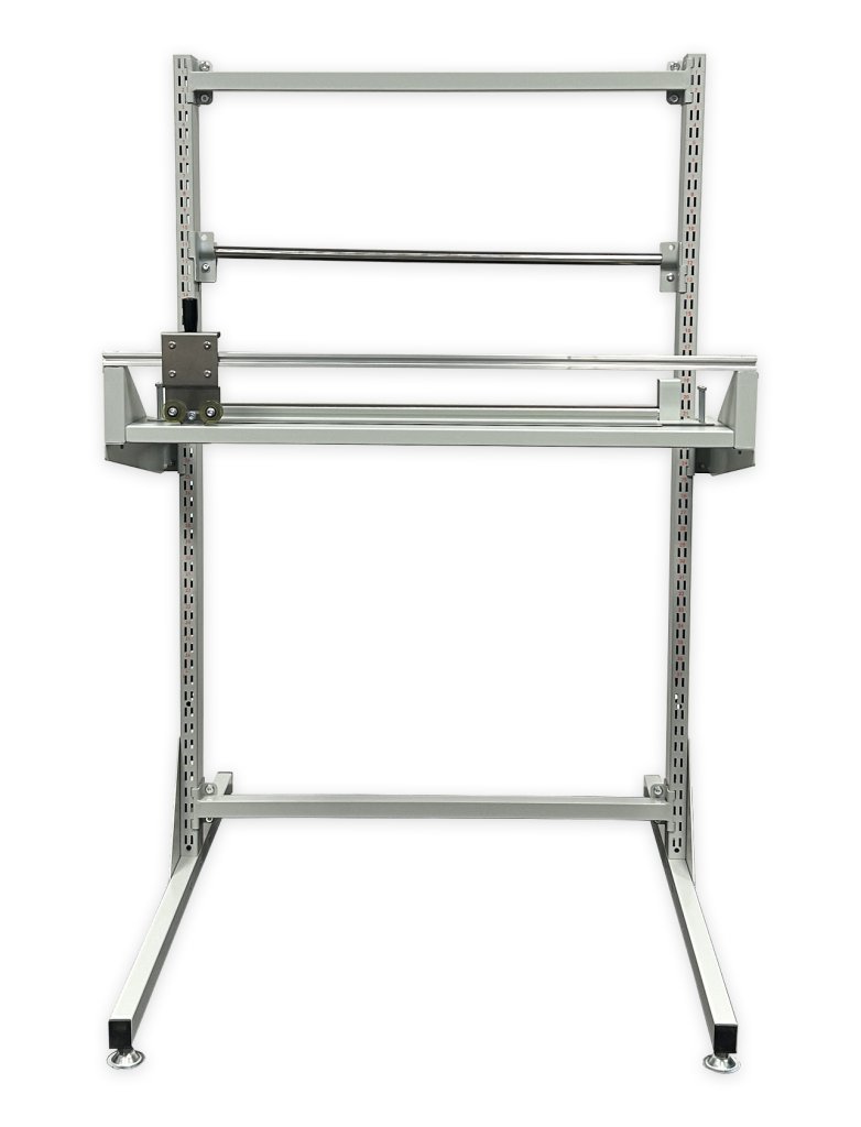 Jednoduchý vodorovný rezací stojan pre rolované baliace materiály. Rozmery: výška 1050 x šírka 950 x dĺžka 1150 mm. Farba konštrukcie čierna.