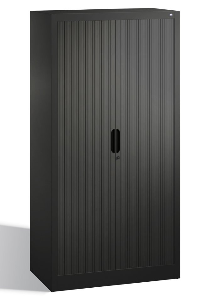 Roletová kovová skriňa dvojdverová. Výška 1660, šírka 800, hĺbka 420 mm. 3 police. Farba korpusu a rolety svetlosivá RAL 7035/antracit RAL 7021.