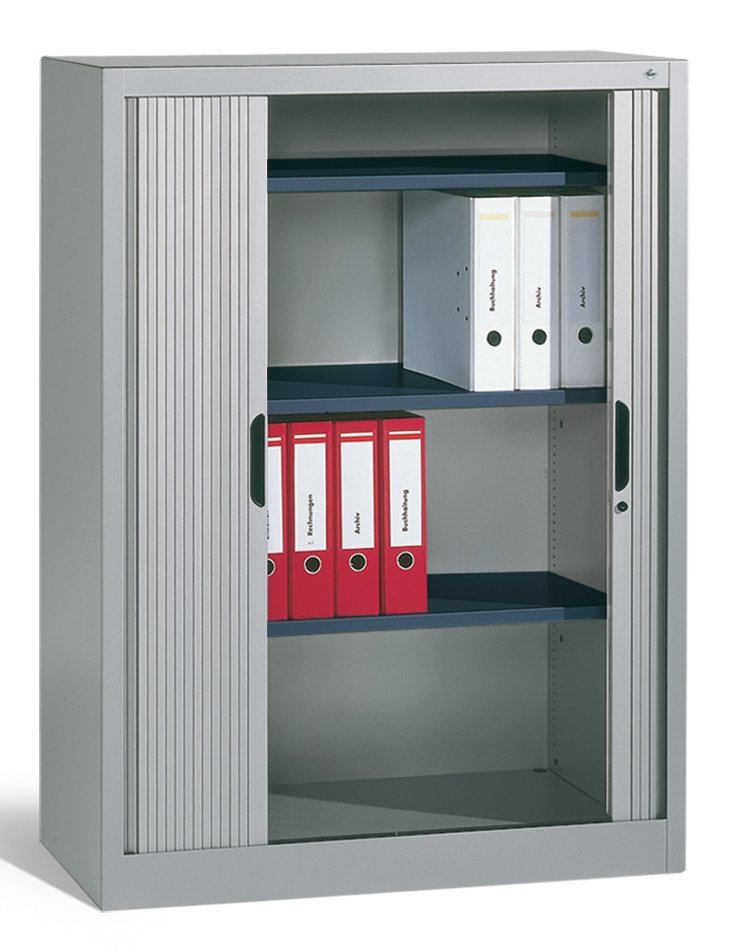 Roletová kovová skriňa dvojdverová. Výška 1345, šírka 1000, hĺbka 420 mm. 3 police. Farba korpusu a rolety svetlosivá RAL 7035/antracit RAL 7021.