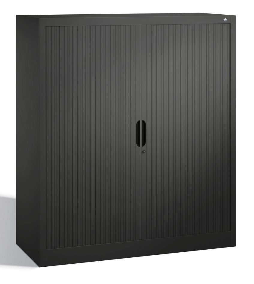 Roletová kovová skriňa dvojdverová. Výška 1345, šírka 1200, hĺbka 420 mm. 3 police. Farba korpusu a rolety svetlosivá RAL 7035/antracit RAL 7021.