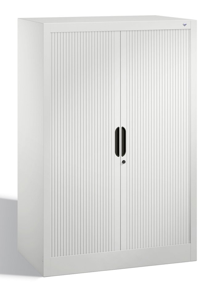 Roletová kovová skriňa dvojdverová. Výška 1230, šírka 800, hĺbka 420 mm. 2 police. Farba korpusu a rolety svetlosivá RAL 7035 celý popis a parametre