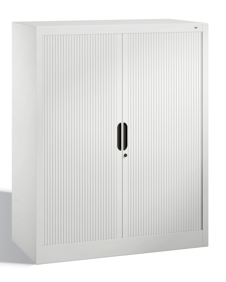 Roletová kovová skriňa dvojdverová. Výška 1230, šírka 1000, hĺbka 420 mm. 2 police. Farba korpusu a rolety svetlosivá RAL 7035 celý popis a parametre