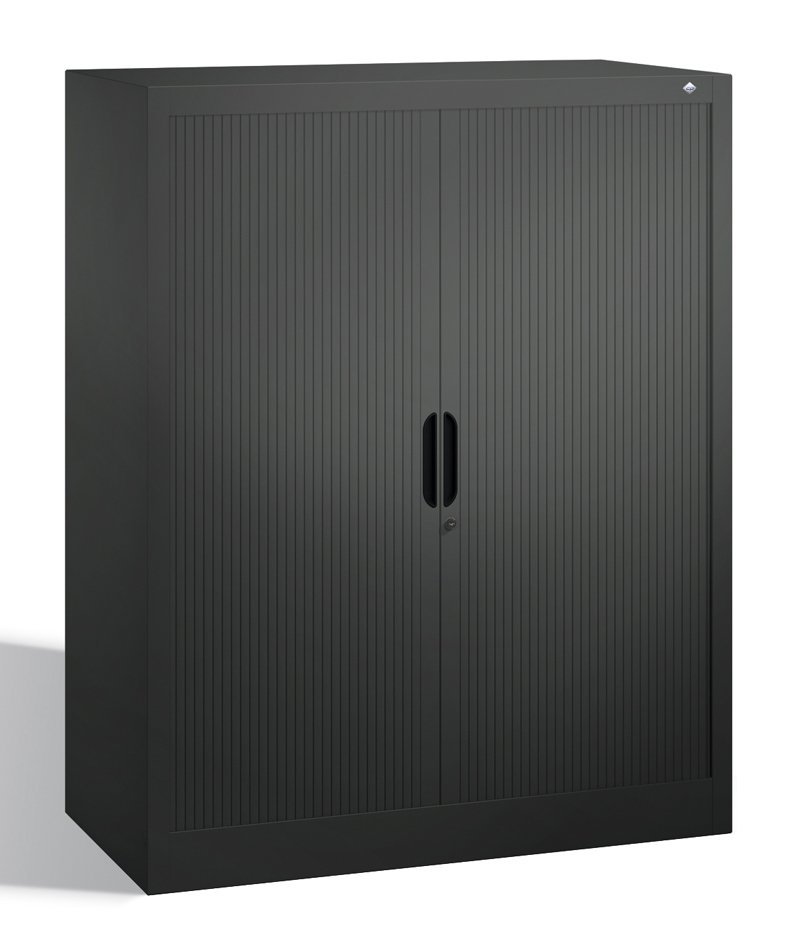 Roletová kovová skriňa dvojdverová. Výška 1230, šírka 1000, hĺbka 420 mm. 2 police. Farba korpusu a rolety svetlosivá RAL 7035/antracit RAL 7021.