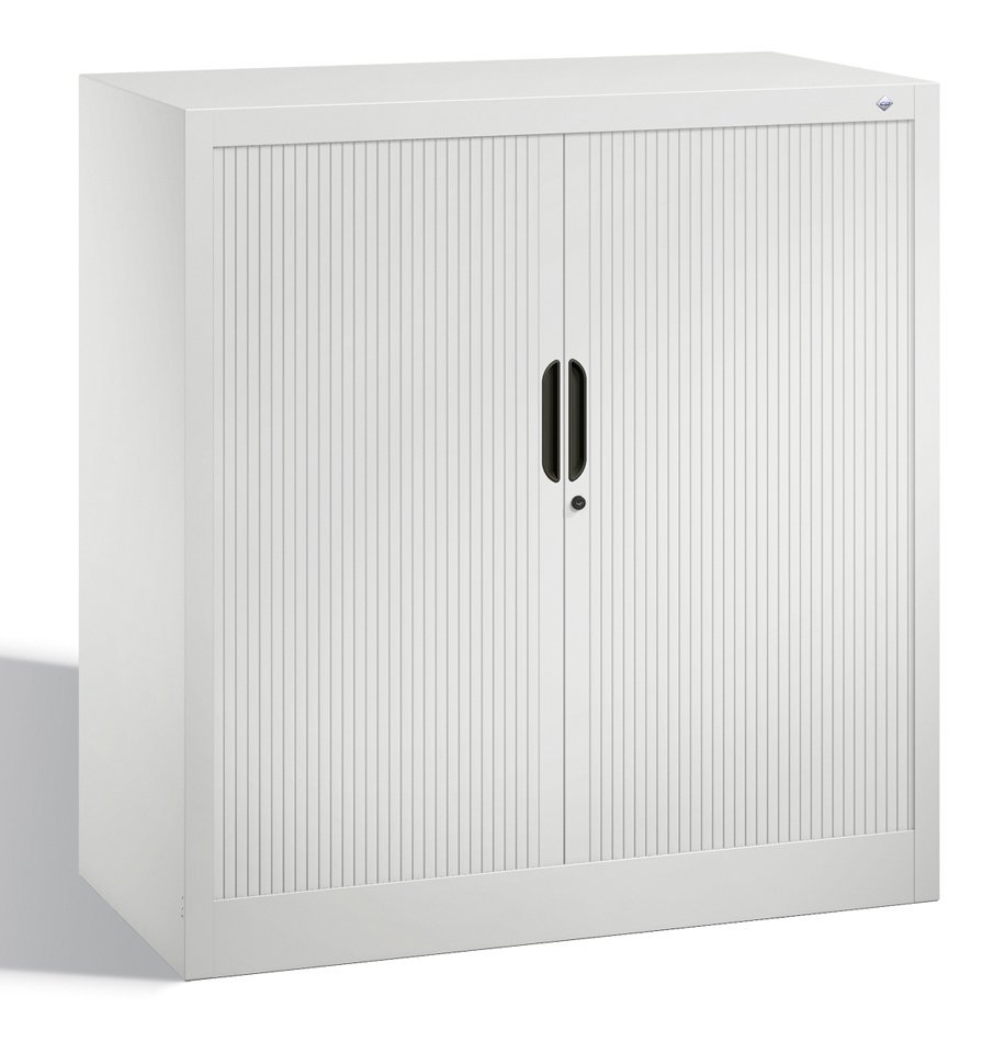 Roletová kovová skriňa dvojdverová. Výška 1030, šírka 1000, hĺbka 420 mm. 2 police. Farba korpusu a rolety svetlosivá RAL 7035 celý popis a parametre