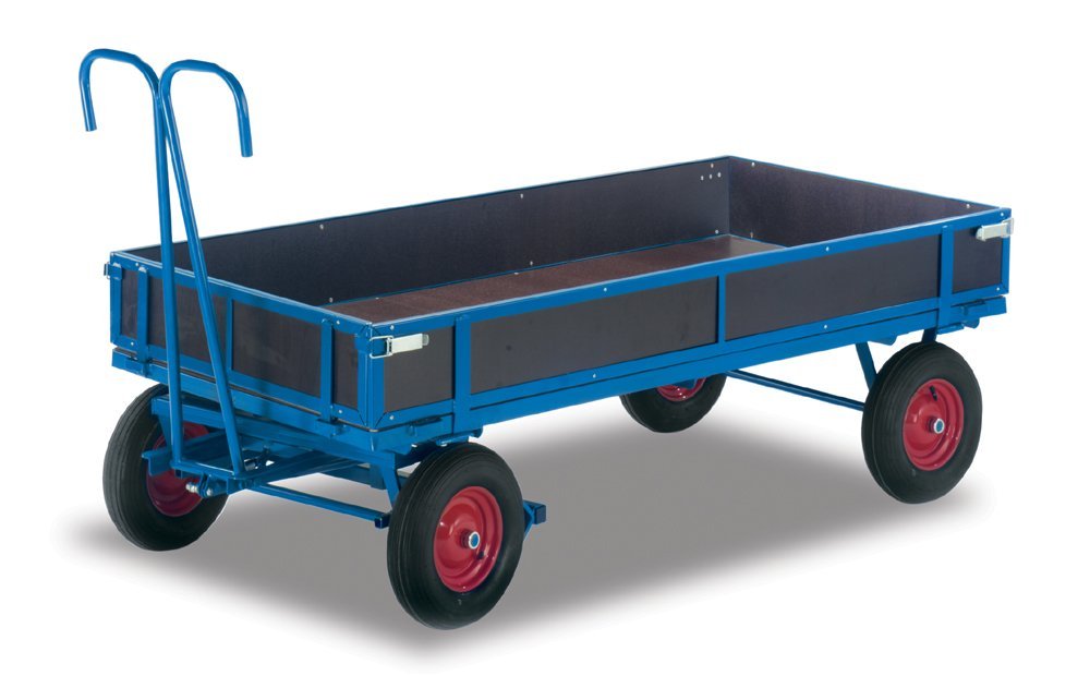 Ručný valníkový vozík nemeckej výroby s ťažným okom, konštrukcia zo zváraných oceľových profilov. Ložná plocha s protišmykové vodeodolné preglejky. Predné dvojkolesové má točnicové riadenie s guličkovo uloženým vencom, ktorý umožňuje pohodlné zatáčanie s plne zaťaženým vozíkom. Ťažná oj je opatrená mäkkou gumovou rukoväťou a ťažným okom. Oj sa pri zastavení automaticky zdvíha a tým spúšťa brzdu predných kolies. Štyri pneumatické kolesá ložisková s automatickou brzdou na predných kolesách. Farba modrá RAL 5007.