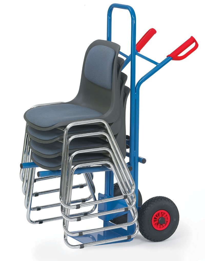 Oceľová rudla nemeckej výroby pre prepravu stoličiek, konštrukcia zo zvarenej ocele, lopata z oceľového plechu, ochranné madlá pre ruky. Farba modrá RAL 5007. Dve pneumatické alebo gumové kolesá ložiskové. Rameno pre prepravu stoličiek je možné sklopiť a podľa potreby umiestniť do príslušnej výšky.