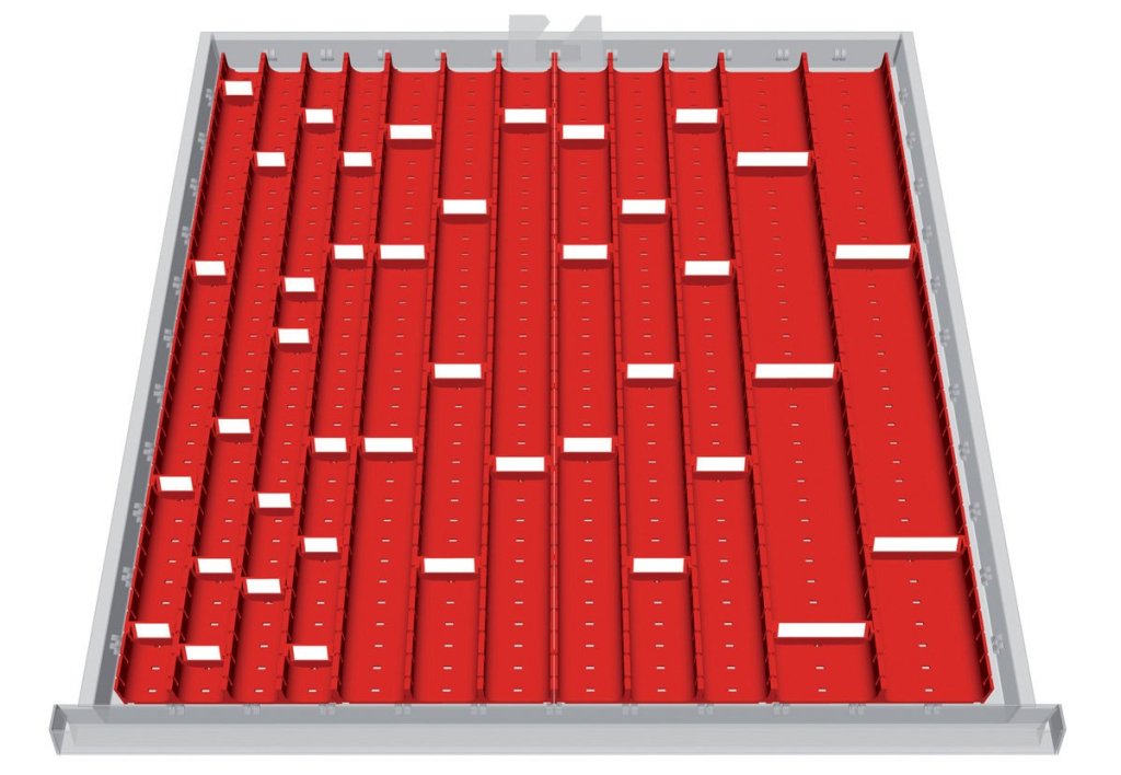 Delenie do zásuviek - set pre 4 zásuvky. Obsahuje 1x gumovou vložku pre zásuvky výšky 50 - 200 mm, 1x plastové delenie pre zásuvky výšky 100 mm, 1x kovové delenie pre zásuvky výšky 100 mm a 1x kovové delenie pre zásuvky výšky 150 mm. Vhodné iba do zásuvkových skríň firmy Bedrunka + Hirth šírky 555 a hĺbky 736 mm.