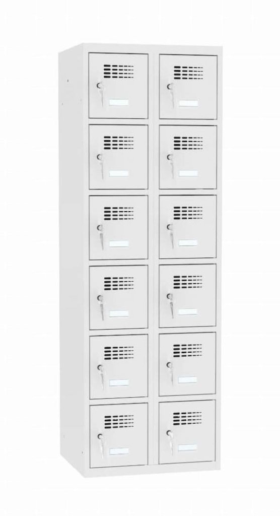 Dvanásťdverová šatníková kovová skrinka so zváranou konštrukciou a moderným dizajnom ventilačného systému. Výška 1800 x šírka 600 x hĺbka 500 mm. Na dverách samolepiaci štítok na meno. 16 farebných odtieňov na výber v cene bez príplatku. Rôzne druhy zamykanie.