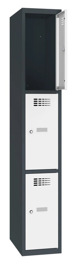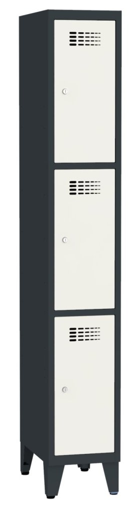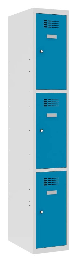 Trojdverová šatníková kovová skrinka so zváranou konštrukciou a moderným dizajnom ventilačného systému. Výška 1800 x šírka 300 x hĺbka 500 mm. Na dverách samolepiaci štítok na meno. 16 farebných odtieňov na výber v cene bez príplatku. Rôzne druhy zamykanie.