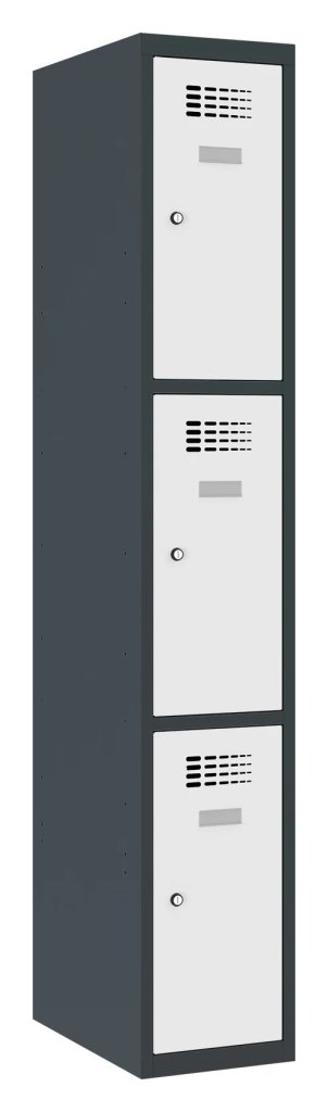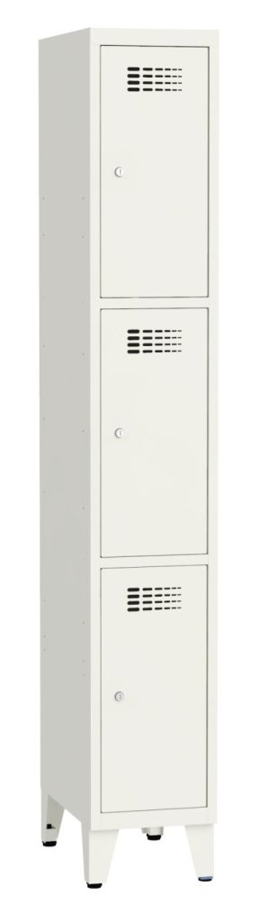 Trojdverová šatníková kovová skrinka so zváranou konštrukciou a moderným dizajnom ventilačného systému. Výška 1800 x šírka 300 x celý popis a parametre