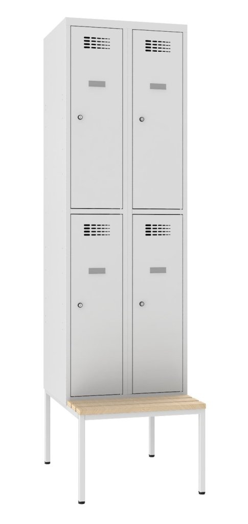 Štvordverová šatníková kovová skrinka s lavicou a moderným dizajnom ventilačného systému. Výška 1800 x šírka 600 x hĺbka 500 mm. Štandardné vybavenie: tyč s háčikmi, samolepiaci štítok na meno. 16 farebných odtieňov na výber v cene bez príplatku. Rôzne druhy zamykanie.