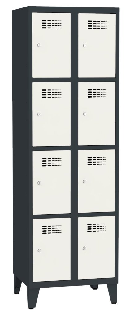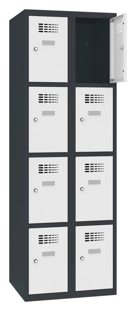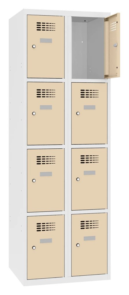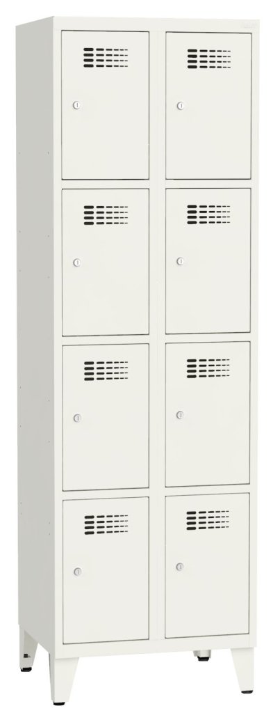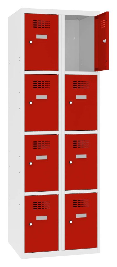 Osmidverová šatníková kovová skrinka so zváranou konštrukciou a moderným dizajnom ventilačného systému. Výška 1800 x šírka 600 x hĺbka 500 mm. Na dverách samolepiaci štítok na meno. 16 farebných odtieňov na výber v cene bez príplatku. Rôzne druhy zamykanie.