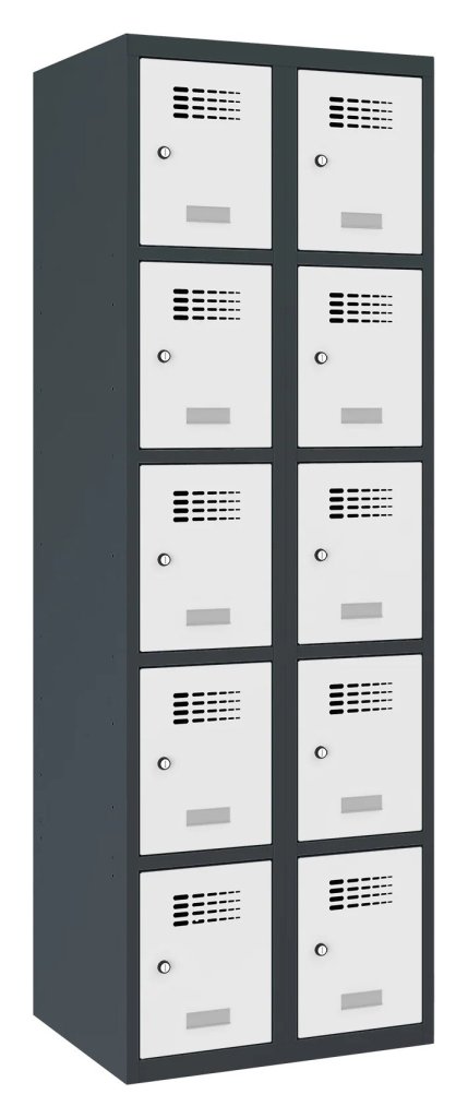 Desetidverová šatníková kovová skrinka so zváranou konštrukciou a moderným dizajnom ventilačného systému. Výška 1800 x šírka 600 x hĺbka 500 mm. Na dverách samolepiaci štítok na meno. 16 farebných odtieňov na výber v cene bez príplatku. Rôzne druhy zamykanie.