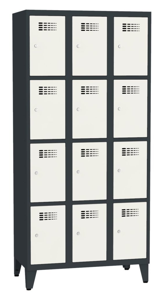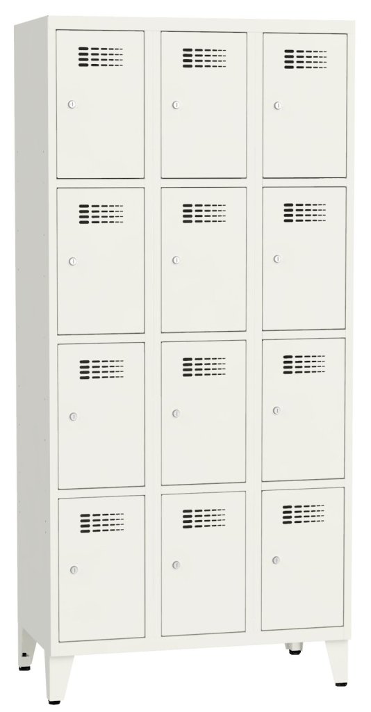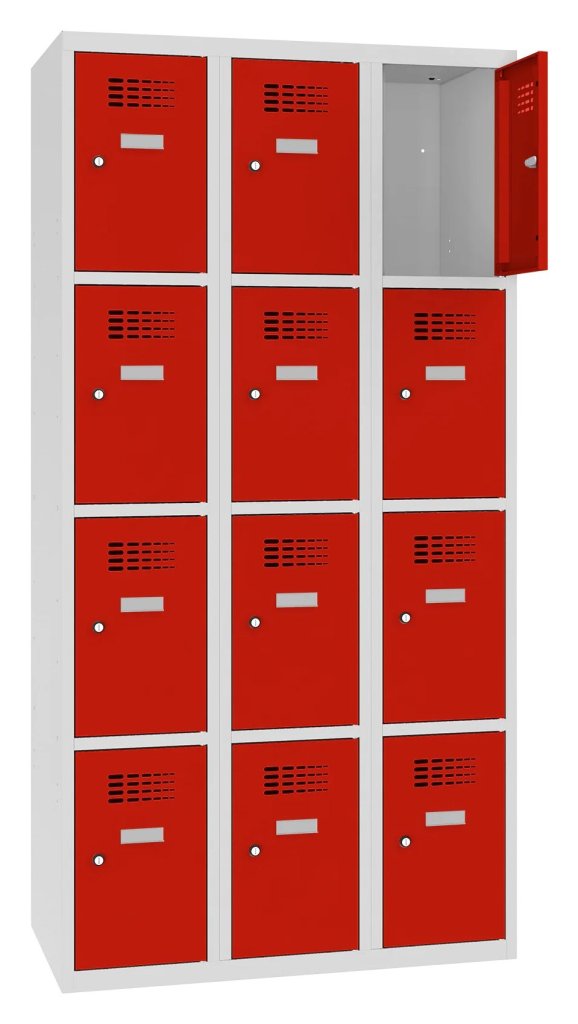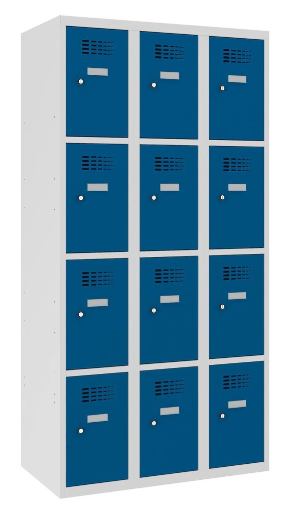 Dvanáctidverová šatníková kovová skrinka so zváranou konštrukciou a moderným dizajnom ventilačného systému. Výška 1800 x šírka 900 x hĺbka 500 mm. Na dverách samolepiaci štítok na meno. 16 farebných odtieňo. Rôzne druhy zamykanie.