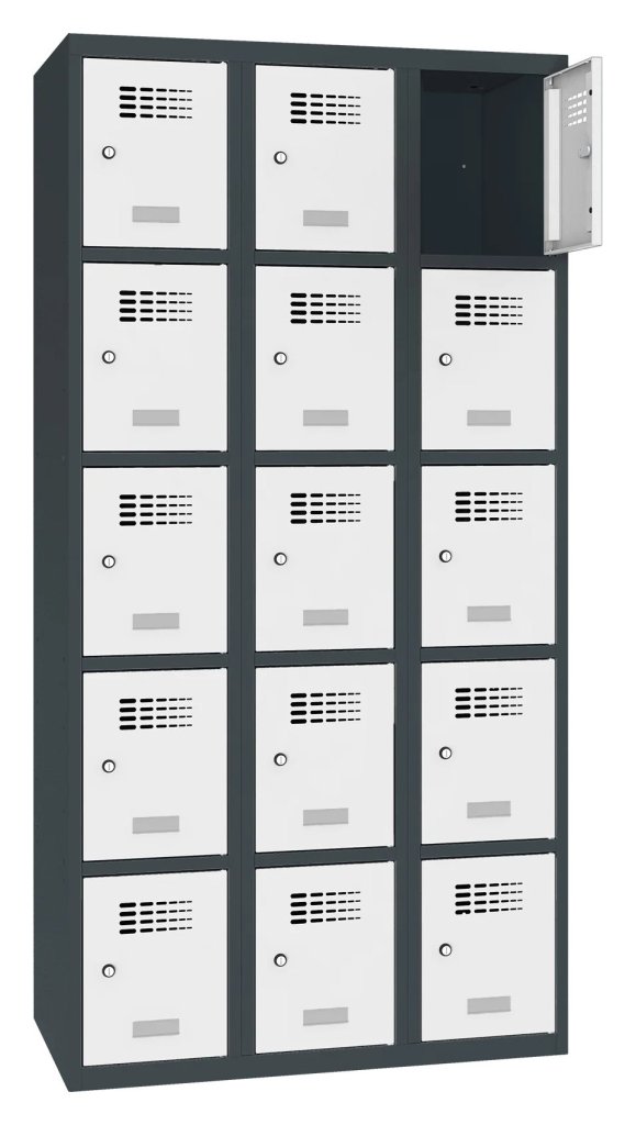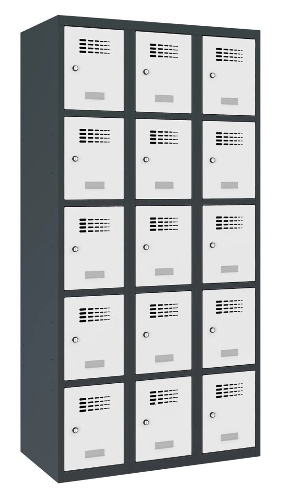 Patnáctidverová šatníková kovová skrinka so zváranou konštrukciou a moderným dizajnom ventilačného systému. Výška 1800 x šírka 900 celý popis a parametre