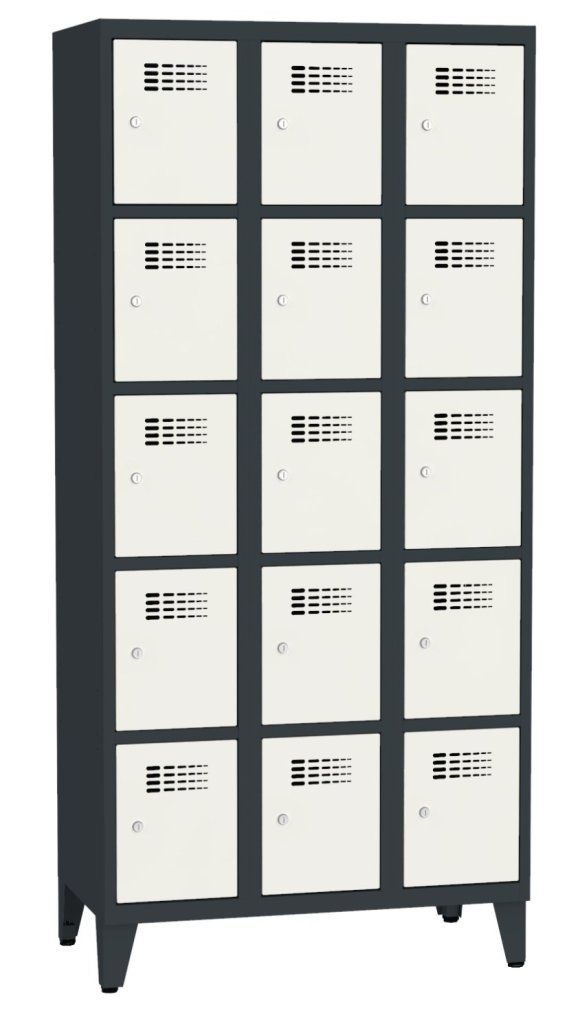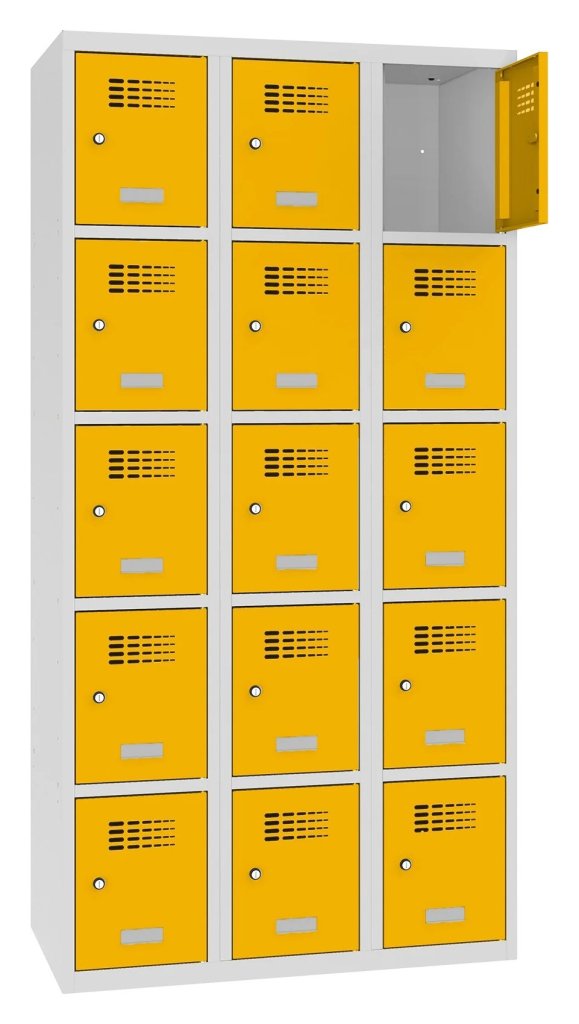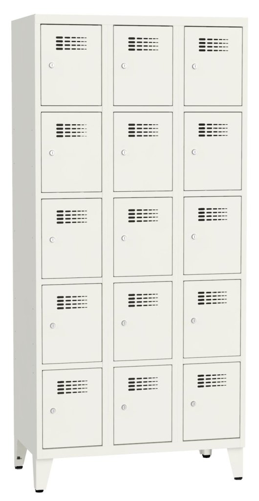 Patnáctidverová šatníková kovová skrinka so zváranou konštrukciou a moderným dizajnom ventilačného systému. Výška 1800 x šírka 900 x hĺbka 500 mm. Na dverách samolepiaci štítok na meno. 16 farebných odtieňov. Rôzne druhy zamykanie.