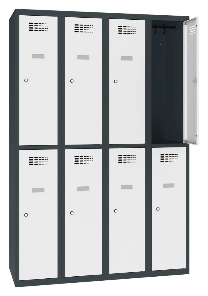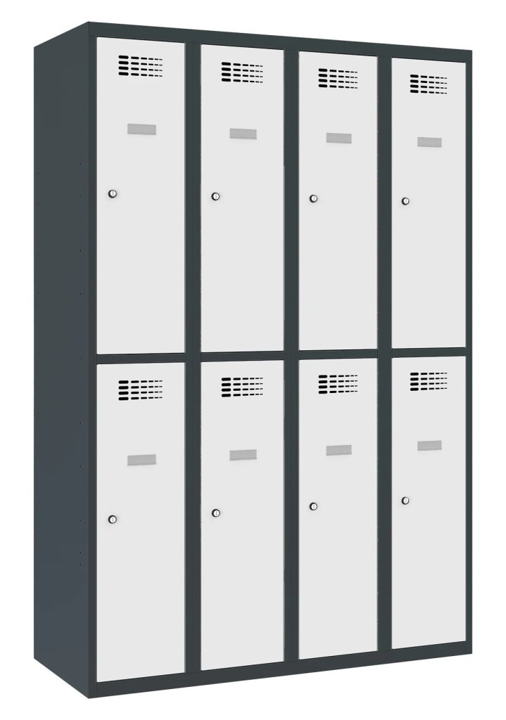Osmidverová šatníková kovová skrinka so zváranou konštrukciou a moderným dizajnom ventilačného systému. Výška 1800 x šírka 1200 x celý popis a parametre
