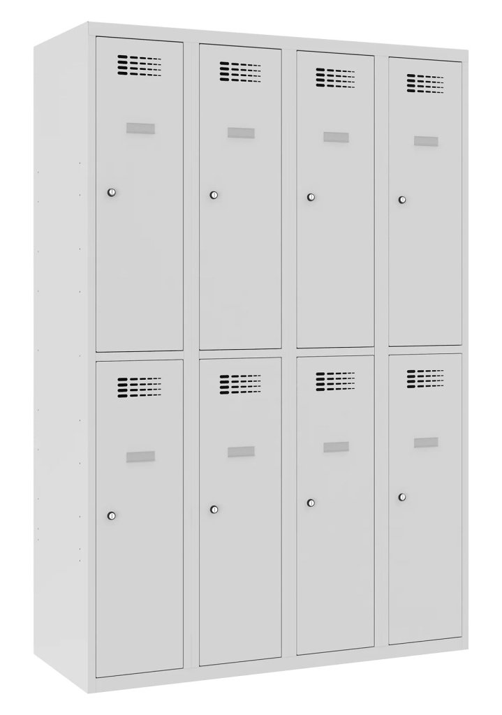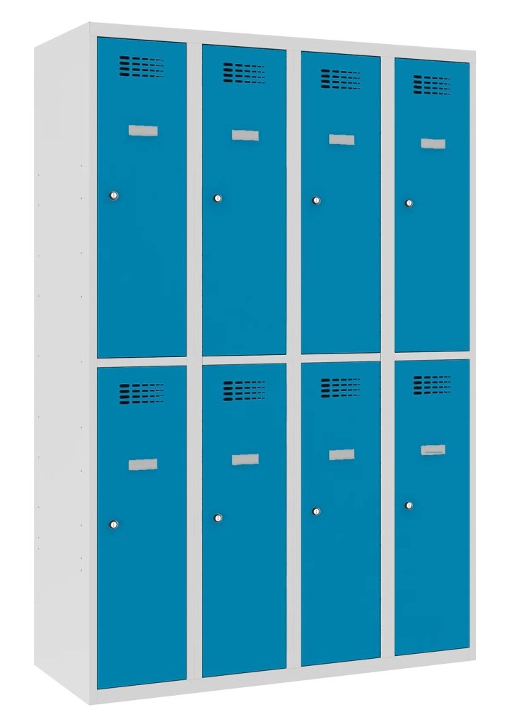 Osmidverová šatníková kovová skrinka so zváranou konštrukciou a moderným dizajnom ventilačného systému. Výška 1800 x šírka 1200 x hĺbka 500 mm. Štandardné vybavenie: tyč s háčikmi, samolepiaci štítok na meno. 16 farebných odtieňov na výber v cene bez príplatku. Rôzne druhy zamykanie.