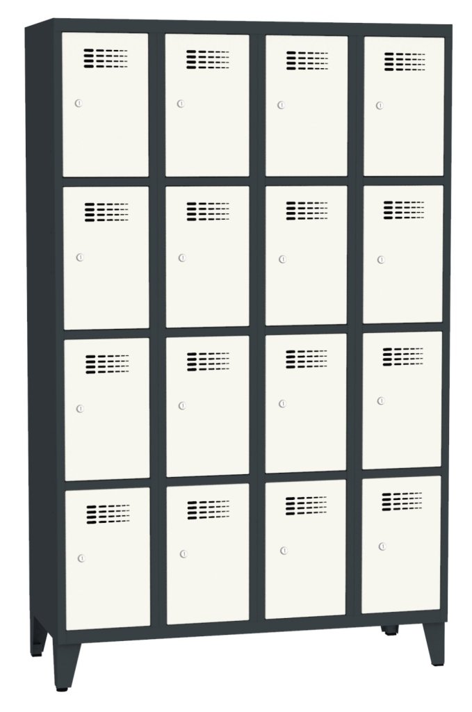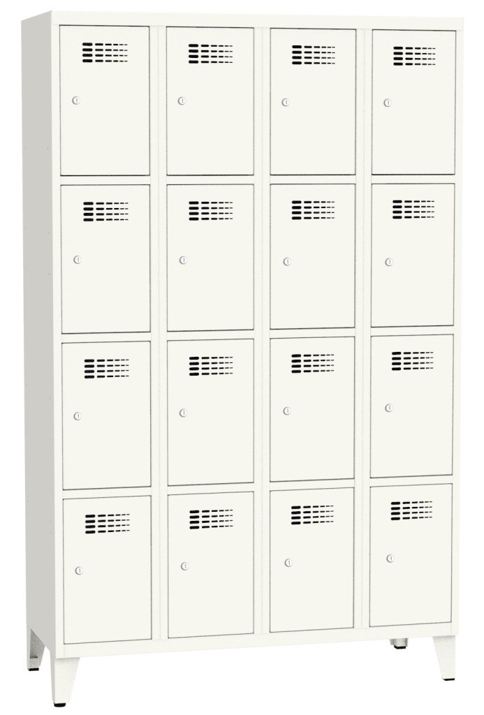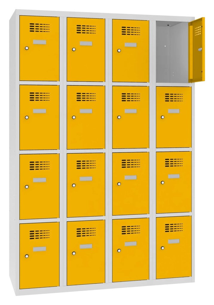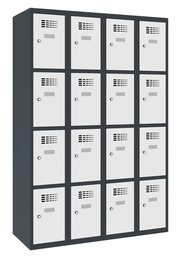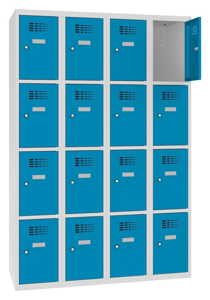 Šestnásťdverová šatníková kovová skrinka so zváranou konštrukciou a moderným dizajnom ventilačného systému. Výška 1800 x šírka 1200 x hĺbka 500 mm. Na dverách samolepiaci štítok na meno. 16 farebných odtieňov na výber v cene bez príplatku. Rôzne druhy zamykania.