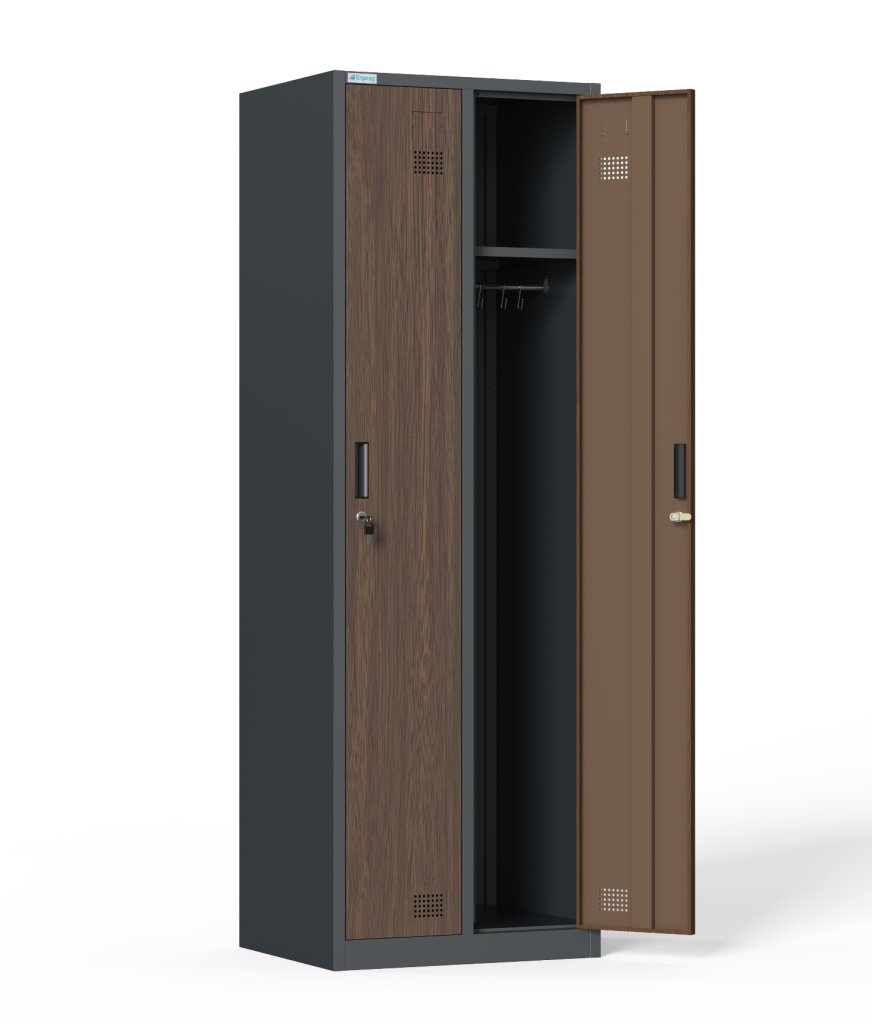 Šatníková DEMONTOVANÁ skrinka kovová, výška 1800 x šírka 600 x hĺbka 500 mm. Uzamykanie cylindrickým zámkom s dvoma kľúčmi. Povrchová úprava práškovou farbou antracit RAL 7016/imitácia tmavé drevo.
