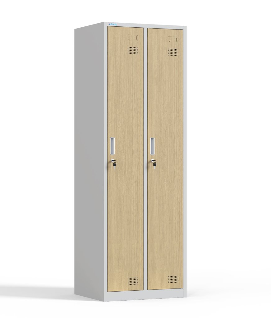 Dvojdverová šatníková skrinka zváraná s moderným dizajnom ventilačného systému. Výška 1800 x šírka 600 x hĺbka 500 mm. Cylindrický zámok. Vybavenie oboch oddelení: tyč s dvoma háčikmi, háčik na uterák, polica nad tyčou, zrkadlo, samolepiaci štítok na meno.