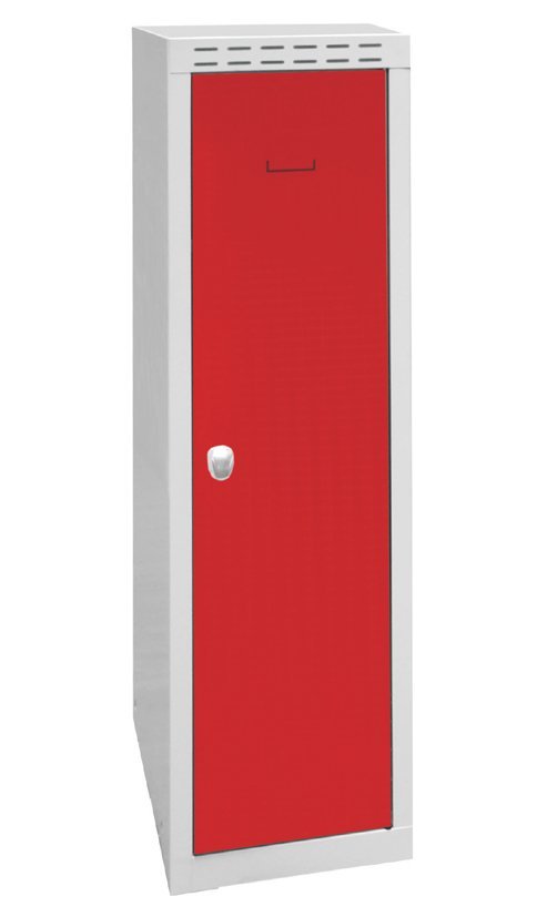 Šatníková skrinka zváraná s dvojplášťovými dverami pre väčšiu bezpečnosť, výška 1500 x šírka 300 x hĺbka 500 mm. Uzamykanie na cylindrický zámok alebo uzáver pro visací zámok, vnútorné vybavenie polica s tyčou na ramienka a háčik. Na prianie s navarenými nohami - výška skrine s nohami 1650 mm. Farba korpusu RAL 7035 svetlo šedá.