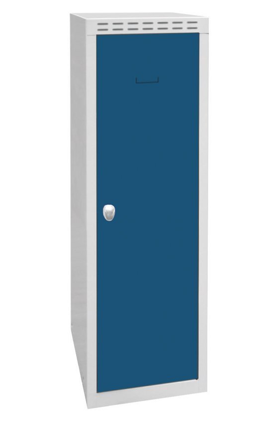 Šatníková skrinka zváraná s dvojplášťovými dverami pre väčšiu bezpečnosť, výška 1500 x šírka 300 x hĺbka 500 mm. Uzamykanie na cylindrický zámok alebo uzáver pro visací zámok, vnútorné vybavenie polica s tyčou na ramienka a háčik. Na prianie s navarenými nohami - výška skrine s nohami 1650 mm. Farba korpusu RAL 7035 svetlo šedá.