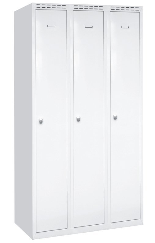 Trojdverová šatníková skrinka zváraná s dvojplášťovými dverami pre väčšiu bezpečnosť, výška 1800 x šírka 900 x hĺbka 500 mm. Uzamykanie na cylindrický zámok alebo uzáver pro visací zámok, vnútorné vybavenie každého oddelenia polica s tyčou na ramienka a háčik. Na prianie s navarenými nohami - výška skrine s nohami 1950 mm. Farba korpusu RAL 7035 svetlo šedá.