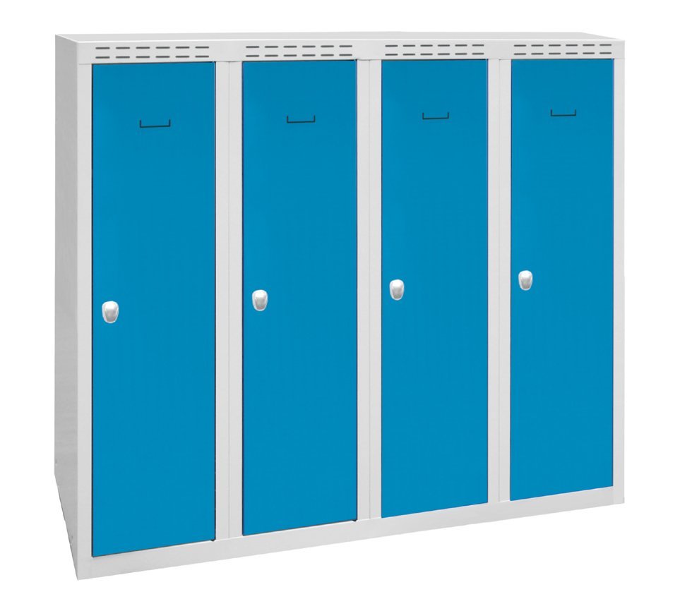 Štvordverová šatníková skrinka zváraná s dvojplášťovými dverami pre väčšiu bezpečnosť, výška 1500 x šírka 1200 x hĺbka 500 mm. Uzamykanie na cylindrický zámok alebo uzáver pro visací zámok, vnútorné vybavenie každého oddelenia polica s tyčou na ramienka a háčik. Na prianie s navarenými nohami - výška skrine s nohami 1650 mm. Farba korpusu RAL 7035 svetlo šedá.