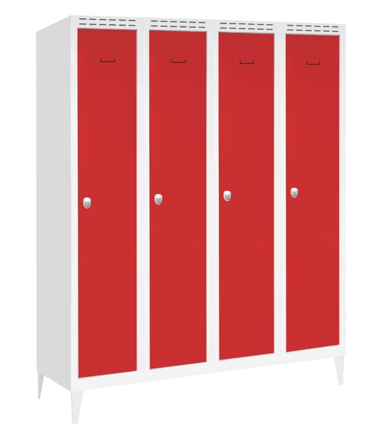 Štvordverová šatníková skrinka zváraná s dvojplášťovými dverami pre väčšiu bezpečnosť, výška 1500 x šírka 1200 x hĺbka 500 mm. Uzamykanie na cylindrický zámok alebo uzáver pro visací zámok, vnútorné vybavenie každého oddelenia polica s tyčou na ramienka a háčik. Na prianie s navarenými nohami - výška skrine s nohami 1650 mm. Farba korpusu RAL 7035 svetlo šedá.
