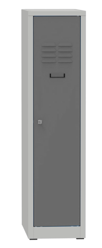 Šatníková skrinka zváraná, výška 1500 x šírka 300 x hĺbka 500 mm. Uzamykanie na cylindrický zámok alebo uzáver pro visací zámok, vnútorné vybavenie polica s tyčou na ramienka a háčik. Na prianie s navarenými nohami - výška skrine s nohami 1650 mm. Farba korpusu RAL 7035 svetlo šedá.