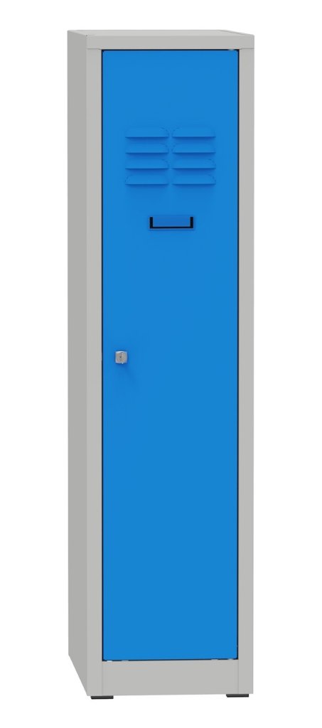 Šatníková skrinka zváraná, výška 1500 x šírka 300 x hĺbka 500 mm. Uzamykanie na cylindrický zámok alebo uzáver pro visací zámok, vnútorné vybavenie polica s tyčou na ramienka a háčik. Na prianie s navarenými nohami - výška skrine s nohami 1650 mm. Farba korpusu RAL 7035 svetlo šedá.