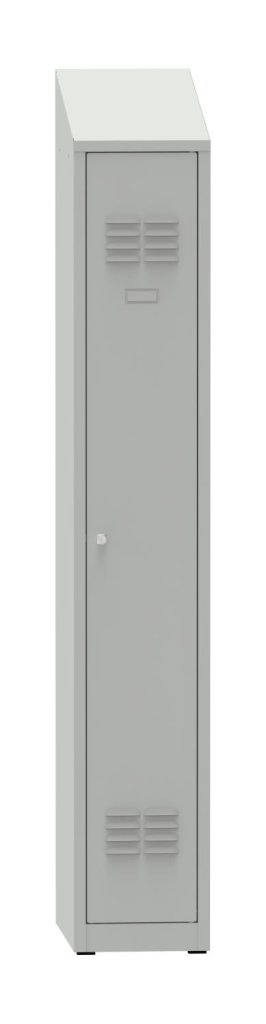 Šatníková skrinka zváraná, výška 1500 x šírka 300 x hĺbka 500 mm. Uzamykanie na cylindrický zámok alebo uzáver pro visací zámok, vnútorné vybavenie polica s tyčou na ramienka a háčik. Na prianie s navarenými nohami - výška skrine s nohami 1650 mm. Farba korpusu RAL 7035 svetlo šedá.