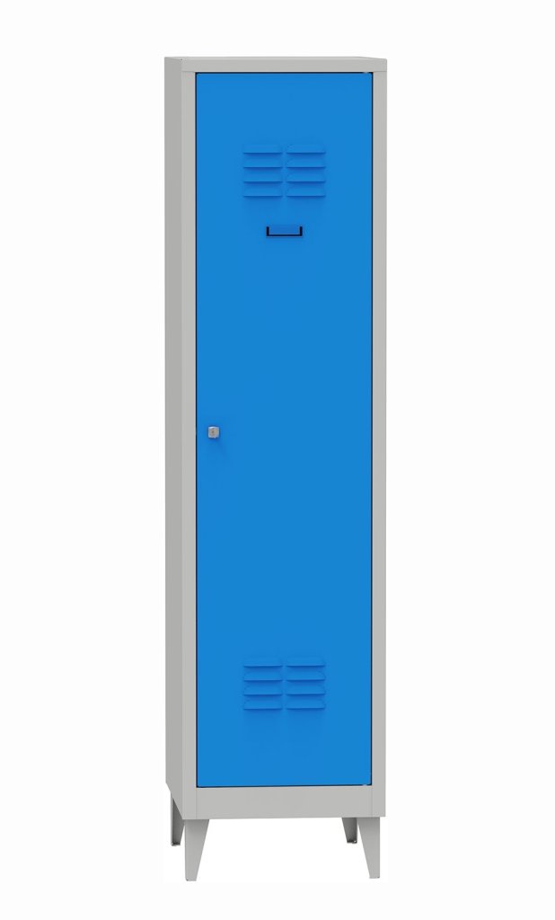 Šatníková skrinka zváraná, výška 1800 x šírka 300 x hĺbka 500 mm. Uzamykanie na cylindrický zámok alebo uzáver pro visací zámok, vnútorné vybavenie polica s tyčou na ramienka a háčik. Na prianie s navarenými nohami - výška skrine s nohami 1950 mm. Farba korpusu RAL 7035 svetlo šedá.
