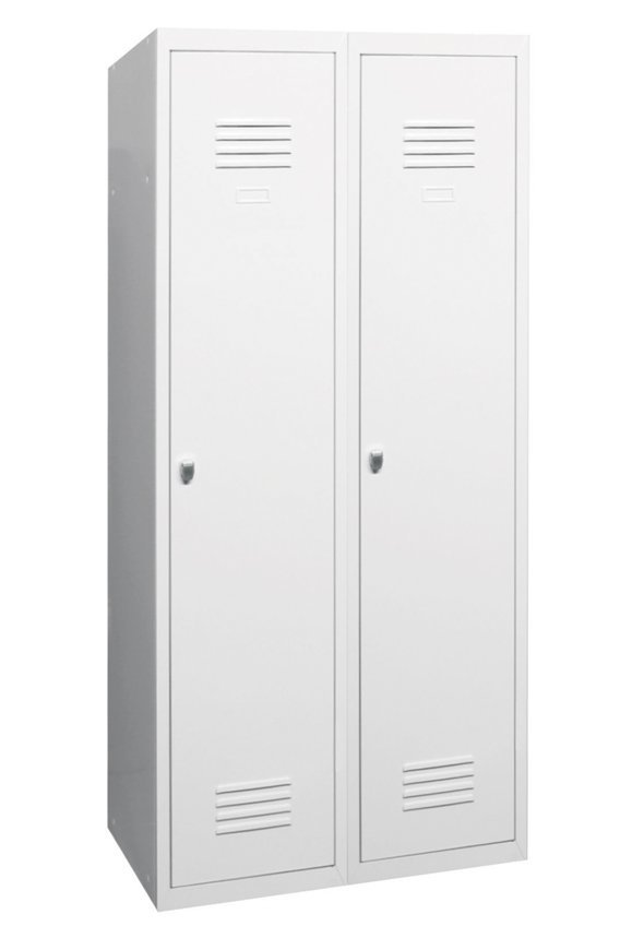 Šatníková skrinka dvojdverová zváraná, výška 1800 x šírka 600 x hĺbka 500 mm. Uzamykanie na cylindrický zámok alebo uzáver pro visací zámok, vnútorné vybavenie každého oddelenia polica s tyčou na ramienka a háčik. Na prianie s navarenými nohami - výška skrine s nohami 1950 mm. Farba korpusu RAL 7035 svetlo šedá.